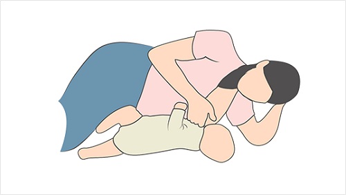 Այս դիրքը հարմար է գիշերային կերակրումների համար, ինչպես նաև այն մայրիկների համար, ովքեր վերականգնվում են կեսարյան հատումից։ Մայրիկը պառկում է կողքի վրա, երեխային տեղադրում իր կողքին՝ դեմքով դեպի կուրծքը։ Այս դիրքը նպաստում է հանգիստ և հարմարավետ կերակրմանը, սակայն պետք է ուշադրություն դարձնել, որ երեխայի շնչառությունը չխոչընդոտվի։