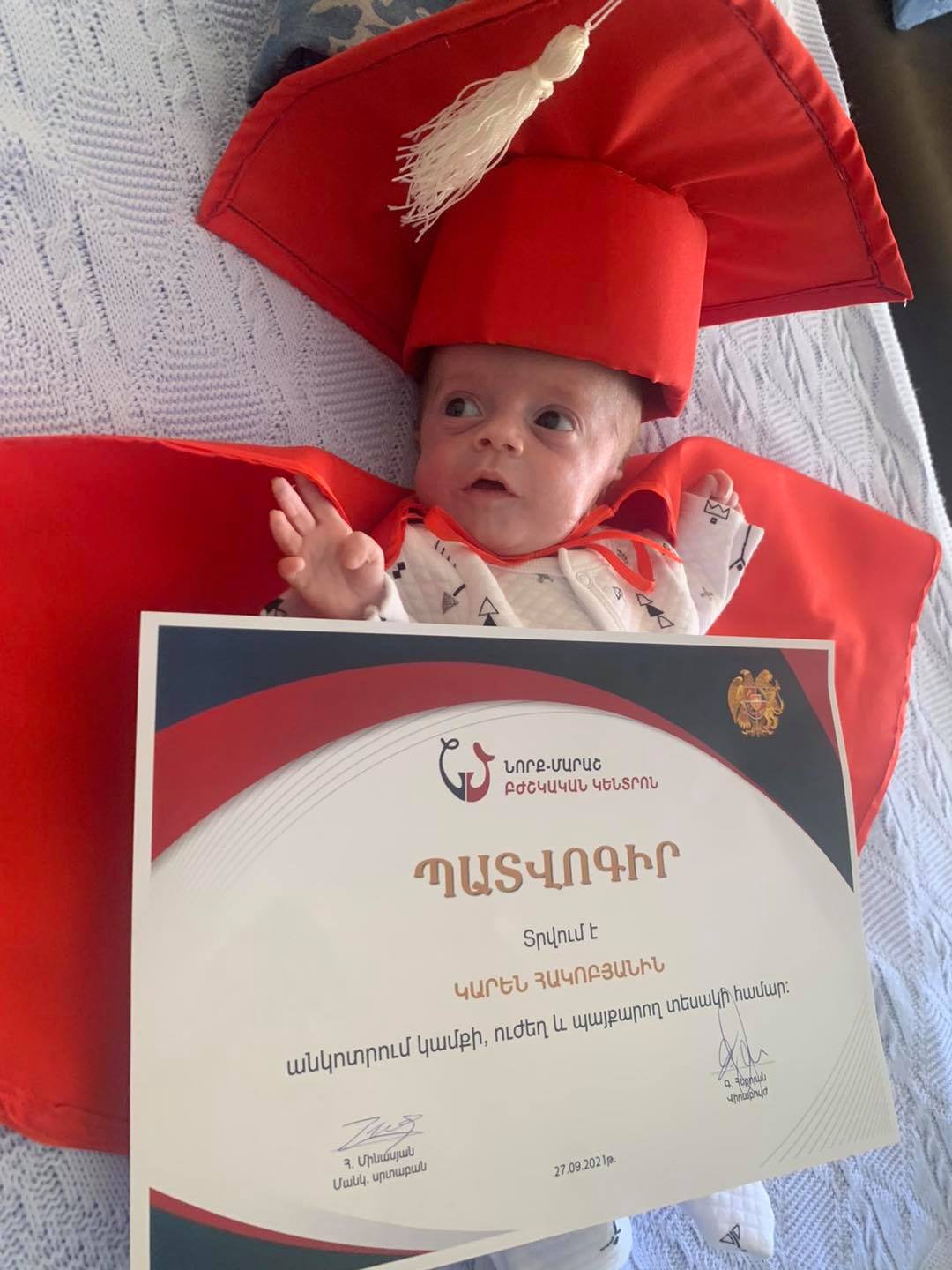 «Իսկ ո՞վ է ասում, որ ուժեղ լինում են միայն մեծերը: Երբեմն փոքրիկի մարմնի մեջ այնքան ուժ, ցանկություն և կամք է լինում ապրելու համար, որ դեմ է լինում բնության բոլոր օրենքներին: Եվ եթե այդ փոքրիկ հրաշքների կողքին հայտնվում են իրենց գործի գիտակներ, երեխան հաղթահարում է ամեն դժվարություն: Ծանոթացեք մեր հերոսներից հերթականի՝ Կարենի հետ: Փոքրիկ, որ պայքարեց և ստիպեց իր հետ պայքարել մի ամբողջ թիմի, փոքրիկ, որ հուսախաբ չարեց իր ծնողներին, փոքրիկ, որ արժանի զավակն է քառօրյա պատերազմի մասնակից հոր: Կարենի մոտ կյանքի առաջին ժամերին ախտորոշվեցին երկու ծանր բնածին արատներ՝ կերակրափողի ընդհատում և աորտայի կրիտիկական նեղացում: Կյանքի երրորդ օրը կատարվեց կերակրափողի ընդհատման շտկում, իսկ 11 օր անց շտկվեց սրտի բնածին արատը։ 2 ծանր վիրահատություններից հետո այսօր արդեն փոքրիկ Կարենը տանն է՝ շնորհիվ «Նորք - Մարաշ» և «Սուրբ Աստվածամայր» ԲԿ-ների բժիշկների համատեղ աշխատանքի: